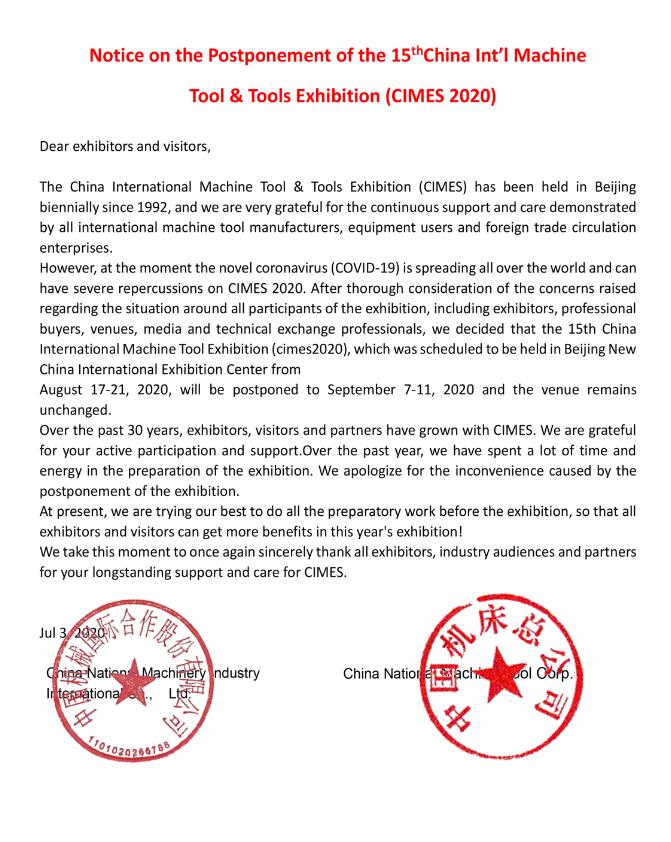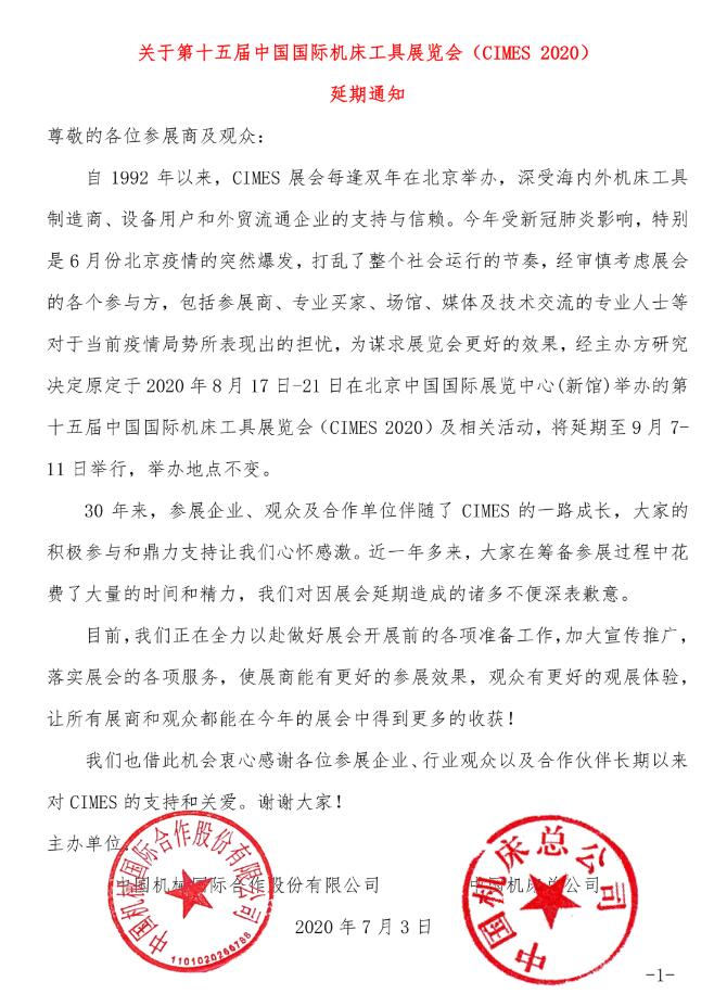 官宣 | 9月7-11日,與您相聚第十五屆中國(guó)國(guó)際機(jī)床工具展覽會(huì)(CIMES 2020)