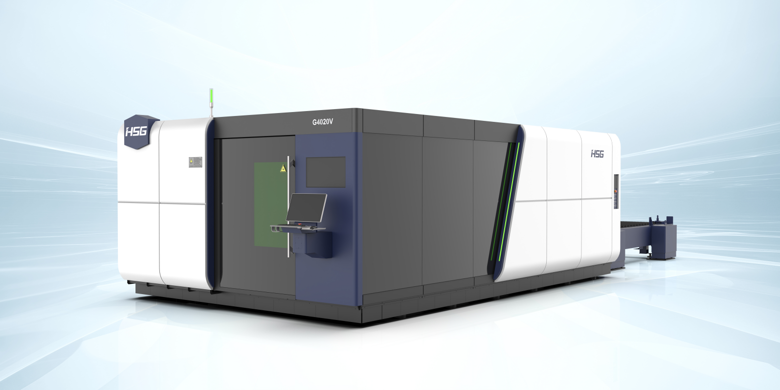 廣東宏石激光技術(shù)股份有限公司G4020V V1.0領(lǐng)航款6G全直驅(qū)激光切割機。加工幅面(長×寬)4064×2040mm,工作臺最大載重約5000kg,可配激光器功率范圍為6000-60000W。X、Y、Z 軸采用直線電機驅(qū)動,全閉環(huán)控制,最大聯(lián)動速度300m/min,最大聯(lián)動加速度6g。床身采用厚板焊接而成,橫梁支撐面寬為470mm,橫梁接觸寬度為650mm,采用中空結(jié)構(gòu),床身不易受熱影響,雙邊四滾柱導(dǎo)軌。配置液壓升降交換系統(tǒng),單臺面交換,沒有高低工作臺之分。具有自動更換噴嘴、視覺尋邊、視覺余料等智能模塊。