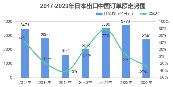 另外,高端機床的功能單元和關鍵零部件等在很大程度上還依賴進口,其中的高端產品對進口的依賴程度仍很突出。中國市場對“德國制造”的高端數控機床、核心功能部件、配套設備的需求依然強勁。德國機床行業在中國市場的主要競爭對手是日本、歐盟等高端品牌。此消彼長,2023年受市場波動及其他因素影響,日本機床對中國訂單額為2740億日元,同比下降27%。近年的訂單走勢如下。