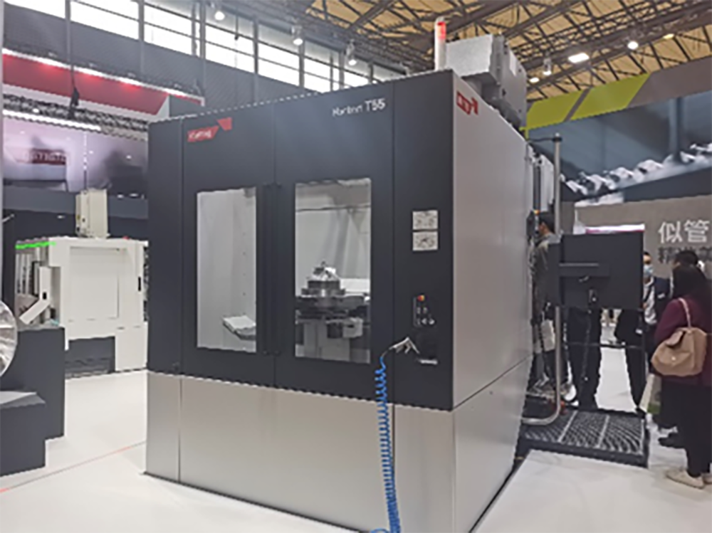 瑞士斯達拉格公司參展的Heckert_T55五軸加工中心以熱對稱設計理念為基礎,其理念不僅體現在框架總成的力傳遞,其機身的排屑也落在居中的排屑器內,配置高速搖籃機構,其搖籃機構位于機床工作臺兩側,兩側為同步驅動,可進行高動態聯動加工。托盤采用凹面(下凹6µm)設計,保證平穩,托盤中配置13路液壓夾緊裝置,為形狀復雜,切削力大的工件裝夾提供更多裝夾設計的靈活性,900r/min的高速轉臺能擴展用戶的加工能力,在傳統五軸加工的基礎上,方便實現車削、車銑和滾齒加工,在動態性能、穩定性和精度方面均有獨到之處。同時占地空間最小化,模塊化設計可實現機床的靈活配置,方便與托盤庫,機器人等進行聯機作業,此款機床X/Y/Z軸進給速度80m/min,加速度7/10/6 m/s²,托盤尺寸500×630mm,載重700kg,轉臺最高轉速為900r/min,換刀時間3.6s,托盤交換時間11.5s。