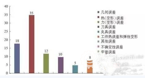 智能功能數控機床向高速、高效、高精化發展,要求數控機床具有熱補償、振動監測、磨損監測、狀態監測與故障診斷等智能功能。融合幾個或幾種智能傳感器,采用人工智能方法,通過識別、分析、判斷及推理,實現數控機床的智能功能,為智能部件的實現打下基礎。 數控機床的誤差包括幾何誤差、熱(變形)誤差、力(變形)誤差、裝配誤差等。研究表明,幾何誤差、熱誤差占到機床總誤差的50%以上,是影響機床加工精度的關鍵因素,如圖1所示。其中,幾何誤差是制造、裝配過程中造成的與機床結構本身有關的誤差,隨時間變化不大,屬于靜態誤差,誤差預測模型相對簡單,可以通過系統的補償功能得到有效控制,而熱誤差隨時間變化很大,屬于動態誤差,誤差預測模型復雜,是國際研究的難點和熱點。