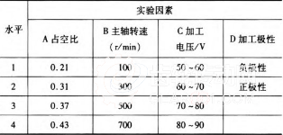 影響因素是指對工藝指標可能產生影響的工藝參數,在電火花放電磨削加工中,影響磨削工藝指標的因素復雜多樣,如果把所有因素都考慮進來,是不科學的,也是不現實的。參照常規電火花磨削工藝規律以及同類型電火花加工設備,本次正交實驗選取占空比、主軸轉速、加工電壓、加工極性4個影響工藝指標的主要實驗因素。