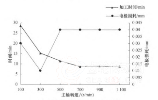 實驗條件:負極性粗加工、占空比0.37、加工電壓60~70 V,對主軸轉速做單因素實驗,實驗結果如表7所示。