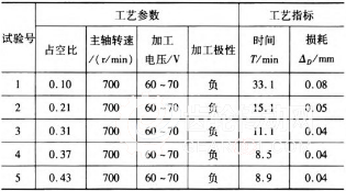 由表9可知:粗加工時,精加工開關和粗加工開關同時打開,粗加工占空比為0.37、加工電壓60~70 V、主軸轉速700 r/min、精加工占空比為0.26,不僅所需加工時間最短,而且對電極的損耗也相對較小。
