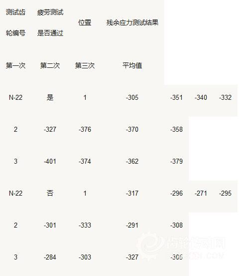 由上述檢測結果可以看出,通過疲勞測試齒附件的殘余壓應力水平明顯高于未通過疲勞測試齒的殘余壓應力水平,越靠近測試齒,表面殘余應力受到測試影響越大,因此,提高殘余壓應力有利于疲勞壽命提高。