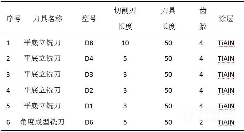 根據(jù)整體式KN95口罩熔接齒模的尺寸、材料等,選擇立銑刀、成型刀分別完成各個加工工序。所選刀具的參數(shù)如表1所示。