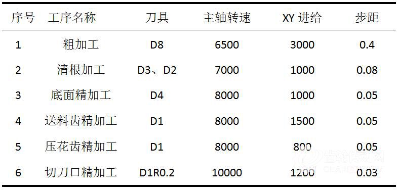 根據(jù)所用毛坯的形狀以及整體式KN95熔接齒模的結(jié)構(gòu)特點,將其加工工序分為整體粗加工、清角加工、底面精加工、送料齒精加工、壓花齒精加工、切刀口精加工。各加工工序所用刀具以及加工參數(shù)如表2所示。