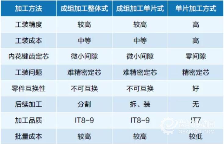 采用整體一體式的,加工完成以后,再分割加工,最后做標記。采用單片成組式的,加工完成后,做標記區分,二種方式可解決各組齒輪內外齒相位一致的問題。