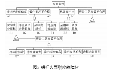 故障定位:通過故障樹分析,蝸桿齒面裂紋原因為磨齒工藝參數不合理A4,具體原因為磨齒時進給量偏大B8、砂輪轉速偏高B9。