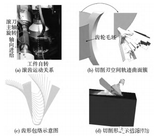 齒輪高速干式滾切加工原理與傳統滾齒加工相似,加工工藝示意圖如圖 2 所示。在分析滾齒運動關系圖 2(a) 的基礎上,為獲得包絡齒形,滾刀和齒坯按一定規律進行展成運動;如圖 2(b) 和(c) 分別為滾刀切削刃空間軌跡曲面簇和齒輪包絡齒形示意圖;圖 2(d) 為采用 Deform-3D 軟件獲得的仿真切屑。齒輪加工原理較為復雜,高速干式滾齒加工涉及較多的工藝參數,與加工效率和加工成本等有密切的聯系,有必要對高速干切滾齒工藝參數優化進行深入探討。