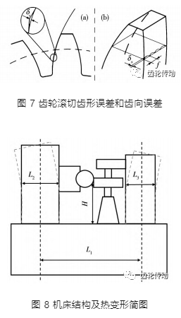 陶桂寶等建立了機床熱變形誤差模型,如圖 8 所示,探究了機床熱變形對滾齒加工精度的影響趨勢,被加工齒輪的齒距累積總偏差由 6 級精度提高到 5 級,對高速干式滾齒機床控制和補償熱誤差 具有一定的參考價值。其中,L1為床身受熱變形前 兩立柱之間的有效長度;L2、L3為大、小立柱的有效寬度; H 為切削點位置對應在大、小立柱處的高度。基于齊次坐標變換原理,鄧峰建立了高速干切滾齒切削力模型和機床幾何誤差重構模型,結果表明切削力的大小與滾刀、齒輪及加工參數有關,可通過提高滾刀的切削速度和減小滾切深度,減小高速干切滾齒的切削力,減小齒輪的加工誤差,提高加工精度。