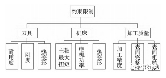 在實際滾齒加工中,機床、加工條件和刀具等技術條件會對加工工藝參數的選擇產生限制作用。因此,需要綜合考慮對應的約束條件,主要包括刀具、機床系統和加工質量等方面的要求。鐘金龍針對高速干切滾齒工藝參數進行優化研究,對滾齒機床輸出功率、加工質量、主軸扭矩、刀具耐用度、切削速度和進給量進行相關約束限制,如圖 9 所示。