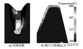 圖 13 高速干式滾齒切屑形貌及刀齒溫度仿真圖