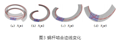 以蝸桿頭數為 1、2、3 和 5 為例,當蝸桿頭數改變時,斜齒輪和蝸桿齒面上的嚙合線變化如圖 3 所示。隨著蝸桿頭數的增加,齒輪齒面上的接觸跡線傾斜度增加,蝸桿齒面的接觸跡線變短,意味著重合度的減少。