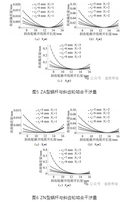 為了對比不同節圓半徑對齒面干涉量的變化情況,分別計算了頭數為1、2、3,節圓半徑為5 mm、6 mm、7 mm 和8 mm的蝸桿,與蝸桿完全共軛的斜齒輪(式 (14))與標準斜齒輪進行比較。圖5和圖6分別為 ZA型蝸桿和ZN 型蝸桿的計算結果。圖中分別對比了相同蝸桿頭數、不同節圓半徑的蝸桿與標準斜齒輪的嚙合干涉量。由圖可知,ZA 型與 ZN 型蝸桿與斜齒輪的齒面干涉量變化規律基本一致,干涉量的大小也基本一致。