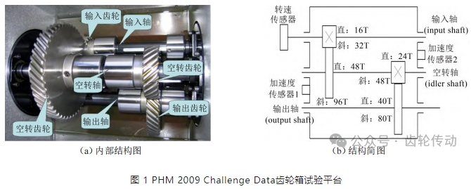 本節采用PHM 2009 Challenge Data中小型試驗臺正/斜齒輪的故障數據集進行分析。該數據集是PHM協會在2009年國際競賽中公開的全套齒輪箱數據,包括正/斜齒輪、軸承和軸的故障,其試驗平臺的內部結構和結構簡圖如圖1(a)至圖1(b)所示。齒輪箱內部包含輸入軸、空轉軸、輸出軸,兩對齒輪副,嚙合方式分為直齒輪模式和斜齒輪模式。箱體兩側各裝有振動加速度傳感器以采集信號。