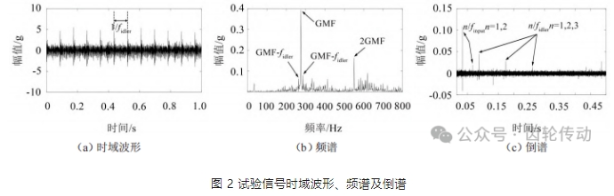 選擇分析左側測點數據,正齒輪嚙合模式,故障齒輪安裝在空轉軸,輸入轉速為35 Hz,采樣頻率為 66.67 kHz,采樣時長 4 秒,取前 1 秒數據。時域波形、頻譜及倒頻譜如圖2(a)至圖2(c)所示。