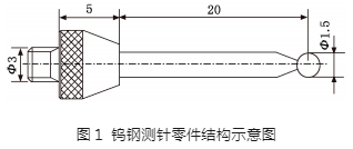 所加工的鎢鋼測針零件結構示意圖如圖1所示,在進行垂直激光燒蝕試驗過程中,需將總長28mm 的針件豎直固定在加工平臺正下方,在測針尖端加工微球頭。