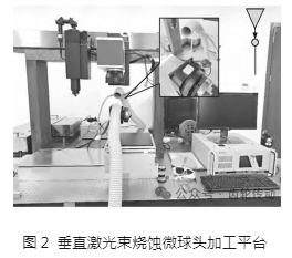 垂直激光束燒蝕加工微球頭是一種常見的微加工技術,它可以用于制作微型光學器件、微流體器件等。將激光束垂直照射到材料表面,通過調節激光照射參數,控制加熱時間和功率,逐步去除材料,形成微球頭的形狀。此次試驗采用鎢鋼(碳化鎢-鈷)制作測針微球頭,實驗室所用激光加工儀器為 BC-2900銦尼鐳斯激光加工平臺,如圖2所示。