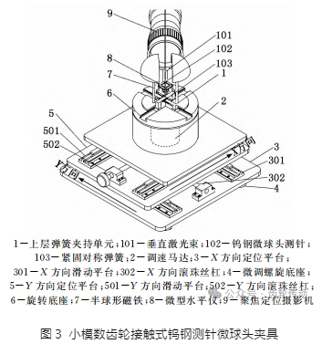 2、小模數齒輪接觸式鎢鋼測針微球頭夾具整體設計