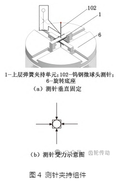 測針夾持組件由上層彈簧夾持單元1、旋轉底座 6、半球形磁鐵7、微型水平儀8組成,通過采用上層彈簧夾持單元上方的兩對對稱安裝的緊固彈簧,以及下方的滑動導軌連接,實現了對鎢鋼微球頭測針的夾持和放松功能。上層彈簧夾持單元能夠固定鎢針在水平方向上的位置,如圖4(a)所示。同時,在夾持單元平面上安裝微型水平儀,并通過最下方的微調螺旋底座對夾持平面進行調平。這使得鎢鋼微球頭測針能夠垂直于夾持平面,在三個方向上得到固定,如圖4(b)所示。這樣的設計大大增強了夾持組件的穩定性和準確性。