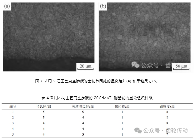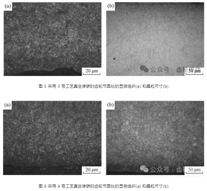 滲碳是高溫長時間的化學處理工藝,工件晶粒易長大,影響其性能。齒輪節圓處晶粒度檢測結果表明,采用 5 號工藝真空滲碳的齒輪節圓處的晶粒度為 7 級,其他工藝真空滲碳的齒輪均為 8 級,說明滲碳溫度提高會導致晶粒粗化。