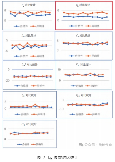 ffa 是齒形形狀偏差,用以評(píng)價(jià)齒形平滑程度,數(shù)值越小,越平滑,精度越高。針對(duì)評(píng)價(jià)齒形齒向的 9 項(xiàng)參數(shù),“異響件”與“合格件”各選 10 件,進(jìn)行對(duì)比。可以看到ffa 參數(shù)存在明顯差異,如圖 2 所示。