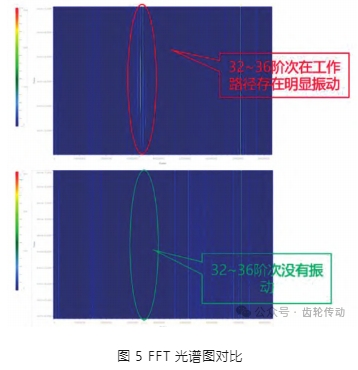 舉例:某珩齒設(shè)備出現(xiàn)加工后零件齒 S 形,對比分析頻譜發(fā)現(xiàn),相比于零件合格時期的狀態(tài),本次故障時 32 ~ 36 階次在工作路徑存在明顯振動,已知高幅值振動區(qū)域后,為了判定該位置是否異常,可對比同一種工況下正常零件的光譜圖,如圖 5 所示,對比正常零件頻譜,在同位置未發(fā)現(xiàn)振動,該階次換算成頻率為 3081~ 3466 Hz,根據(jù)表 3 的經(jīng)驗,該頻率為尾座參與時夾緊系統(tǒng)的共振,重點排查工裝與尾座的同軸度,經(jīng)過重新校準(zhǔn)精度,問題得到解決。