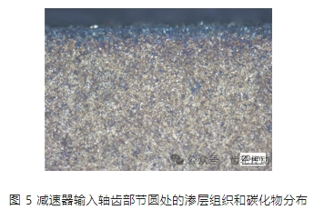 圖 5 為輸入軸齒部節圓處的滲層組織和碳化物分布形貌。如圖 5 所示,輸入軸滲碳層中的馬氏體為 1 級,殘留奧氏體和碳化物為 1 ~ 2 級,達到優質產品的技術要求。