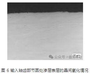 圖 6 為輸入軸齒部節圓處滲層表層的晶間氧化 (IGO) 情況。晶間氧化又稱內氧化,研究認為是由 Cr、Mn、Si 等易氧化元素與氣氛中微量的氧結合形成氧化物,使晶界附近基體合金元素貧化,常出現在可控氣氛滲碳過程中。產生內氧化及合金元素的貧化后,會使其附近奧氏體的穩定性降低,淬透性不足,在隨后的淬火過程中極易發生分解,形成屈氏體和貝氏體等混合組織,一般 ME 級精密齒輪對其都有嚴格的限制。如圖 6 所示,真空低壓滲碳和高壓氣淬的輸入軸在齒部滲層表面未出現晶間氧化情況。