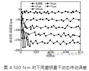 當發生全齒磨損故障時,對各載荷進行動態傳動誤差測試得到圖 4 結果。對圖 4 進行分析可以發現,逐漸提高齒面磨損量時,形成了更大的動態傳動誤差。當載荷提高后,曲線可以在更短時間內進入穩態階段,大幅減小了波動性,形成了更大的動態傳動誤差 γ 絕對值。