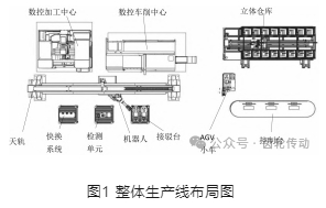 整條柔性機加生產(chǎn)線由立體倉庫、數(shù)控車削中心 (DONABATTCN10)、數(shù)控加工中心(VMC-850L)、自動上下料系統(tǒng)、視覺檢測單元組成,如圖1所示。生產(chǎn)線采用直線型布局,依次布置立體倉庫、數(shù)控車削中心、數(shù)控加工中心和自動上下料系統(tǒng)。自動上下料系統(tǒng)主要由 AGV 小車、接駁臺、天軌(第七軸),工業(yè)機器人、夾爪快換系統(tǒng)、機床自動推拉門、機床自動松緊夾具等模塊組成。