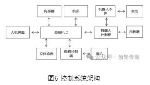 整個柔性生產(chǎn)線控制系統(tǒng)硬件主要包括總控PLC、人機界面、天軌電機驅(qū)動器、天軌電機、機器人控制柜、立體倉庫控制器以及傳感器系統(tǒng),如圖6所示。采用混合控制方式, 立體倉庫配備了獨立的 PLC 以實現(xiàn)精準地倉儲管理,加工機床和機器人擁有專屬的控制器保障其高效運作,同時設(shè)置了西門子 S7-1200PLC作為總控對整體系統(tǒng)進行協(xié)調(diào)控制。各部分與總控PLC實時通信,進行數(shù)據(jù)交互。