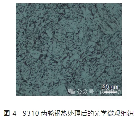 本工作以 9310 齒輪鋼為實驗材料,熱處理狀態為正火與回火相結合,9310 齒輪鋼熱處理后基本力學性能為:彈性模量 E=207 GPa,泊松比 v=0.3,密度 ρ=7.84 g/cm3 ,抗拉強度 σb≥1079 MPa。圖 4 為 9310 齒輪鋼熱處理后的微觀組織,可以看出,熱處理后 9310 齒輪鋼的組織由大量白色鐵素體、少量分布鐵素體之間的低碳馬氏體和呈顆粒狀分布在晶界和晶內的碳化物組成。