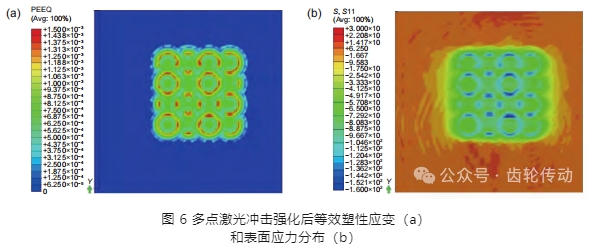 從零件全生命周期來看,激光沖擊強化工藝的作用主要是在不影響零件使用功能的前提下,盡可能提高零件疲勞壽命。一般認為,表面狀態變量如表面殘余應力、顯微硬度等這些中間變量較好,即殘余應力分布越均勻、殘余壓應力越大、表面硬度越高,零件疲勞壽命越好。激光沖擊強化后材料表面狀態的評價可采用有限元數值模擬方法,也可采用實驗方法研究。本工作對殘余應力分布均勻情況研究采用有限元數值模擬方法,對殘余壓應力大小和顯微硬度研究采用實驗方法。有限元數值模擬的目的是評估采用的激光沖擊強化加工路徑方案形成的表面殘余應力場空間分布是否均勻 。圖 6(a)為等效塑性應變分布情況,圖 6(b)和(c)為應力分量的表面和空間分布情況。可以看出,等效塑性應變分布和應力分布存在一定程度數值波動,但總體上相對均勻。對于空間應力分布,實驗測試涉及材料的剝離問題以及剝離過程中殘余應力釋放,獲得完整空間應力分布需要較大實驗量。采用數值模擬方法,可在較少時間成本下獲得激光沖擊強化加工路徑方案的應力空間分布規律。