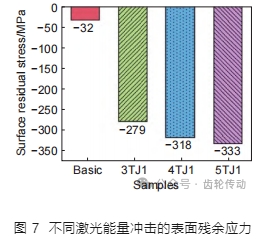 不同激光能量對試樣表面殘余應力影響情況如圖 7 所示,其中縮寫 3JT1、4JT1 和 5JT1 分別代表激光能量為 3、4 J 和 5 J,沖擊強化 1 次。從圖 7 中可以看出,基體材料表面殘余壓應力為–32 MPa,這可能來源于試樣機械加工過程。激光沖擊強化后,激光能量 3、4 J 和 5 J 對應的表面殘余壓應力分別為–279、–318 MPa 和–333 MPa,隨著激光能量增加,表面殘余壓應力也隨之增大。激光能量從 3 J 增加到 4 J,表面殘余壓應力增加 13.9%;而激光能量從 4 J 增 加到 5 J,表面殘余壓應力僅增加 4.7%。