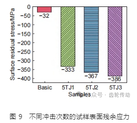 選定激光能量為 5 J,光斑搭接率為 50%,光斑直徑為 2.2 mm,討論激光沖擊次數分別為 1、2 次和 3 次時對殘余應力場和顯微硬度的影響。圖 9 顯示不同激光沖擊強化次數下材料表面殘余應力分布的情況,其中縮寫 5TJ1、5TJ2 和 5TJ3 分別代表激光沖擊次數為 1、2 次和 3 次,激光能量為 5 J。從圖 9 中可以得到,基體材料表面殘余應力為–32 MPa,試樣經過激光沖擊強化,激光沖擊次數為 1、2 次和 3 次時,對應的表面殘余壓應力分別為–333、–367 MPa 和–386 MPa,沖擊次數從 1 次增加到 2 次時,殘余壓應力提高 10.2%,沖擊次數從 2 次增加到 3 次,殘余壓應力則僅提高了 5.1%。這是由于齒輪鋼的彈性模量和屈服強度較大,隨著激光沖擊次數增加,材料更容易發生硬化現象,使得 材料難以發生塑性變形。因此,殘余壓應力值不會隨著激光沖擊次數增加而一直增大,而表現出飽和趨勢。