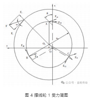根據表 1 我們將 RV 減速器擺線輪的外部負載設為當曲柄轉角為 90°時三個曲柄給擺線輪的作用力 FA、FB、 FC。