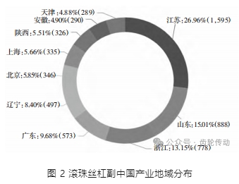 滾珠絲杠副中國產(chǎn)業(yè)地域分布如圖 2 所示。其中,排名前五的是江蘇、山東、浙江、廣東、遼寧,江蘇的申請主體最為活躍,申請專利數(shù)量為 1595 件,約占全國總量的 26.96%,與其他省份相比,江蘇的專利申請數(shù)量有明顯優(yōu)勢,山東省專利申請量為 888 件,占比 15.01%,浙江專利申請數(shù)量為 778 件,占比 13.15%。