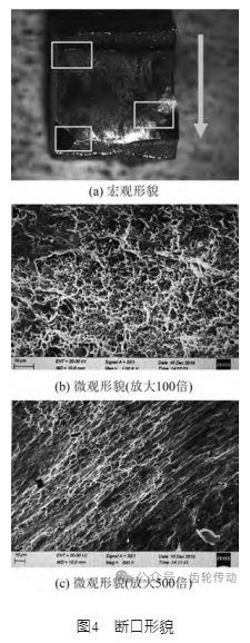 對故障齒圈進(jìn)行斷口分析,并查找失效原因,結(jié)果如圖4所示。由圖4(a)可知:斷口于齒根處斷裂,由一側(cè)向另一側(cè)呈剪切斷裂,斷口左右兩側(cè)存在顯著的剪切滑移痕跡,斷口中心呈反光小刻面特征。該宏觀形貌屬于典型的兩邊韌性斷裂、中間脆性斷裂。由圖4(b)和圖4(c)可知:起斷區(qū)呈現(xiàn)韌窩形貌,且未發(fā)現(xiàn)夾雜等缺陷;中間區(qū)域為韌窩形貌,韌窩為拉長韌窩,與斷裂方向平行;止斷區(qū)形貌與中間區(qū)域形貌一致,整體形貌表現(xiàn)為材料拉伸滑移,且滑移方向與應(yīng)力方向一致。