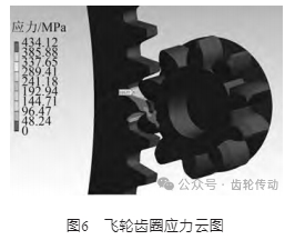 在 Ansys Workbench 中根據(jù)表 3 賦予相應(yīng)材料后,將齒輪嚙合面設(shè)置摩擦接觸,摩擦因數(shù)為0. 15;約束飛輪齒圈內(nèi)圓所有自由度;放開發(fā)動機(jī)齒輪軸繞軸線的旋轉(zhuǎn)自由度,同時約束其他方向自由度;在發(fā)動機(jī)驅(qū)動齒輪(小齒輪)上加載12 N·m扭矩,查看飛輪齒圈應(yīng)力變化情況,結(jié)果如圖6所示。