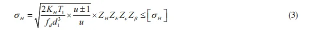 式中:KH為接觸疲勞強(qiáng)度計(jì)算的載荷系數(shù);ZH為區(qū)域系數(shù);ZE為彈性系數(shù);Zε為重合度系數(shù);Zβ為螺旋角系數(shù)。