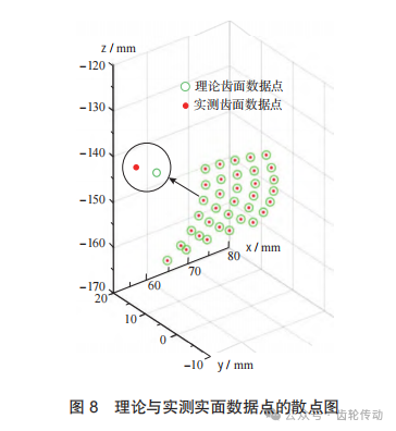 根據圖7確定的測量路徑對螺旋錐齒輪齒面進行測量,獲得實測點齒面坐標點集Q。在MATLAB2020軟件中繪制理論測量點集P與實際測量點集Q的空間散點圖如圖8所示。由于誤差較小,在三維坐標下看不到全齒面的對應關系,將其局部對應點進行放大展示。其中空心點代表理論測量點,實心點代表實際測量點。