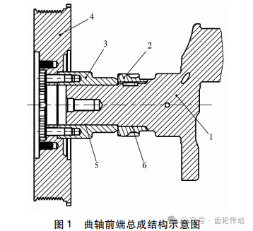 如圖1所示,本文以非道路柴油機用曲軸飛輪總成為案例進行闡述和分析,曲軸前端總成包括:1、曲軸前端,2、曲軸齒輪,3、輪轂,4、減振皮帶輪,其中在曲軸前端上布置有小軸頸5(直徑φ54)、大軸頸6(直徑 φ58)等。