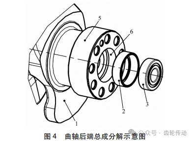 如圖3所示,曲軸后端總成包括:1、曲軸后端,2、擋環,3、滾動軸承,4、飛輪,其中在曲軸后端還布置有后軸頸5(直徑φ54)、后端內孔6(直徑φ52)等。