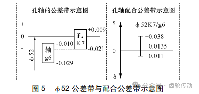 按軸承外殼孔的要求,公差等級IT7,并根據實踐經驗確定 后端座孔的公差帶代號為φ52K7[-0.021~+0.009],將其以圖形的形式表示在圖5中。