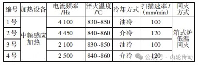 為了研究感應淬火技術對齒輪質量的影響,設計對比試驗,對淬火溫度、冷卻方式、電流頻率進行參數調正,在齒輪檢測后明確不同參數的應用價值。其中頻感應淬火的參數調整參考表1。
