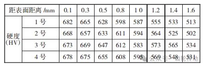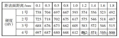1)在開展齒面的硬度梯度檢測中(見表2)。4個方案中的齒面有效硬化層深度都符合設計標準,同時在頻率的降低下,其有效硬化層深度有著增加的特點。需要注意的是,在3號、4號方案的電流頻率更低下,其齒面的有效硬化層深度更大,不過齒面硬度稍低。同時,應用介質冷卻和應用淬火油冷卻時,其有效硬化層深度接近。
