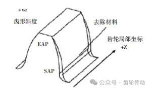 齒形修形符號定義:沿著漸開線方向,在SAP位置去除材料、齒頂位置保持不變時,漸開線斜度符號為正,反之為負,見圖2。