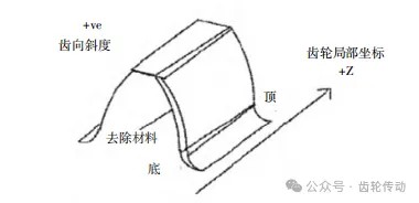 齒向修形符號定義:沿著齒寬方向,在Z軸負方向側去除材料、Z軸正方向保持不變時, 齒向斜度的符號為正,反之為負,見圖3。